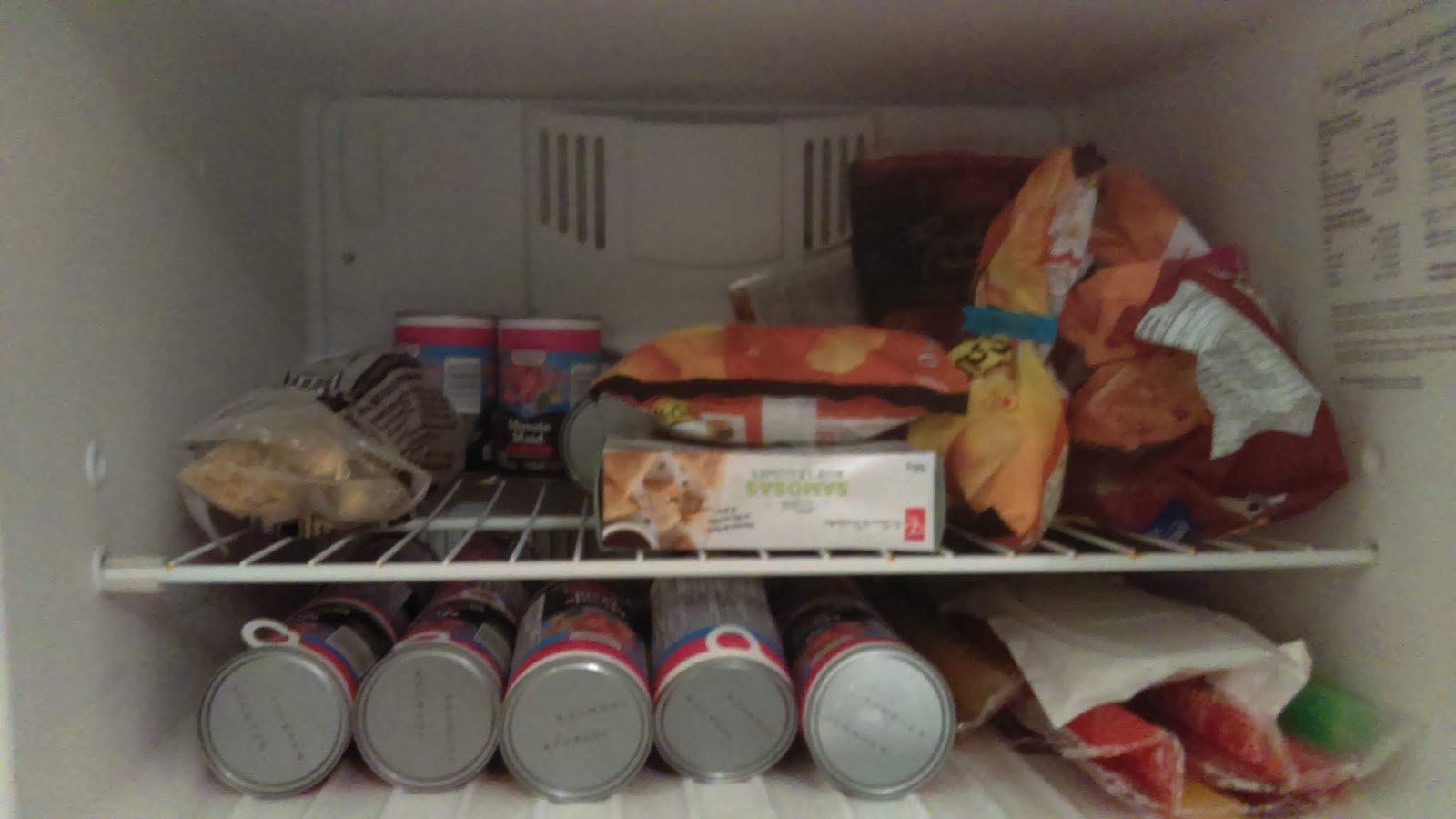 Juice, fries, samosa, chicken fingers and freezies. Oh and some frozen raspberries at the back. It may not look like it, but there is plenty of space for a meat order.